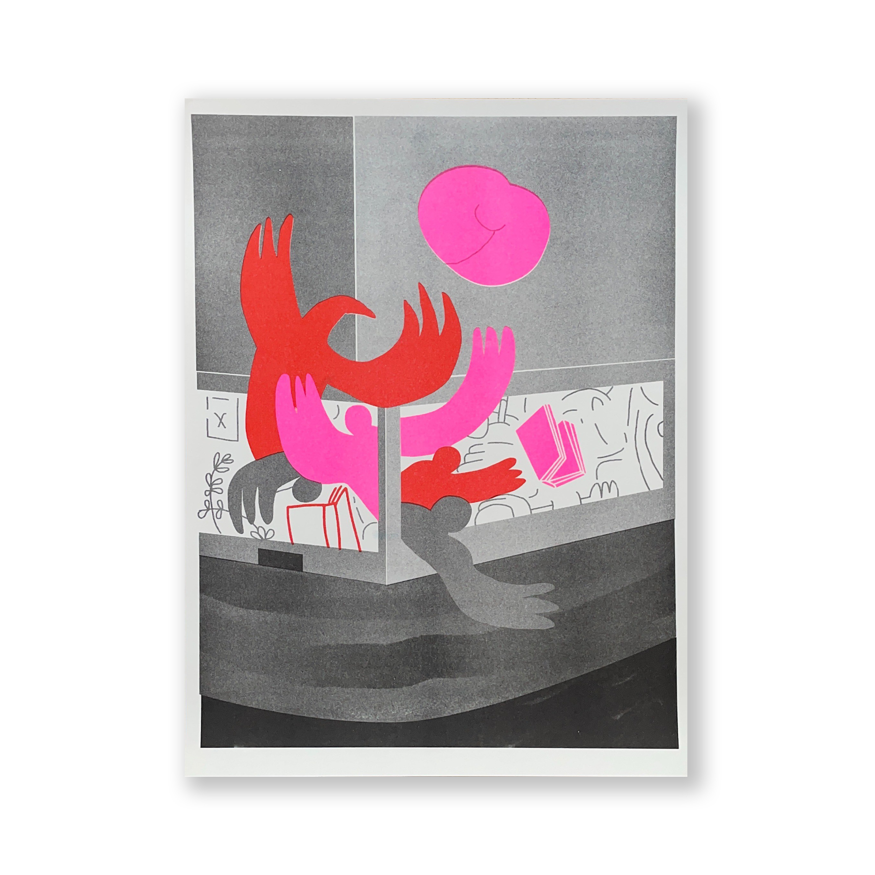 Risografický tisk formátu A3 od autora Jakuba Koise vytištěný k 10. výročí Page Five v nákladu 30 kusů v dílně Kudla Werkstatt.