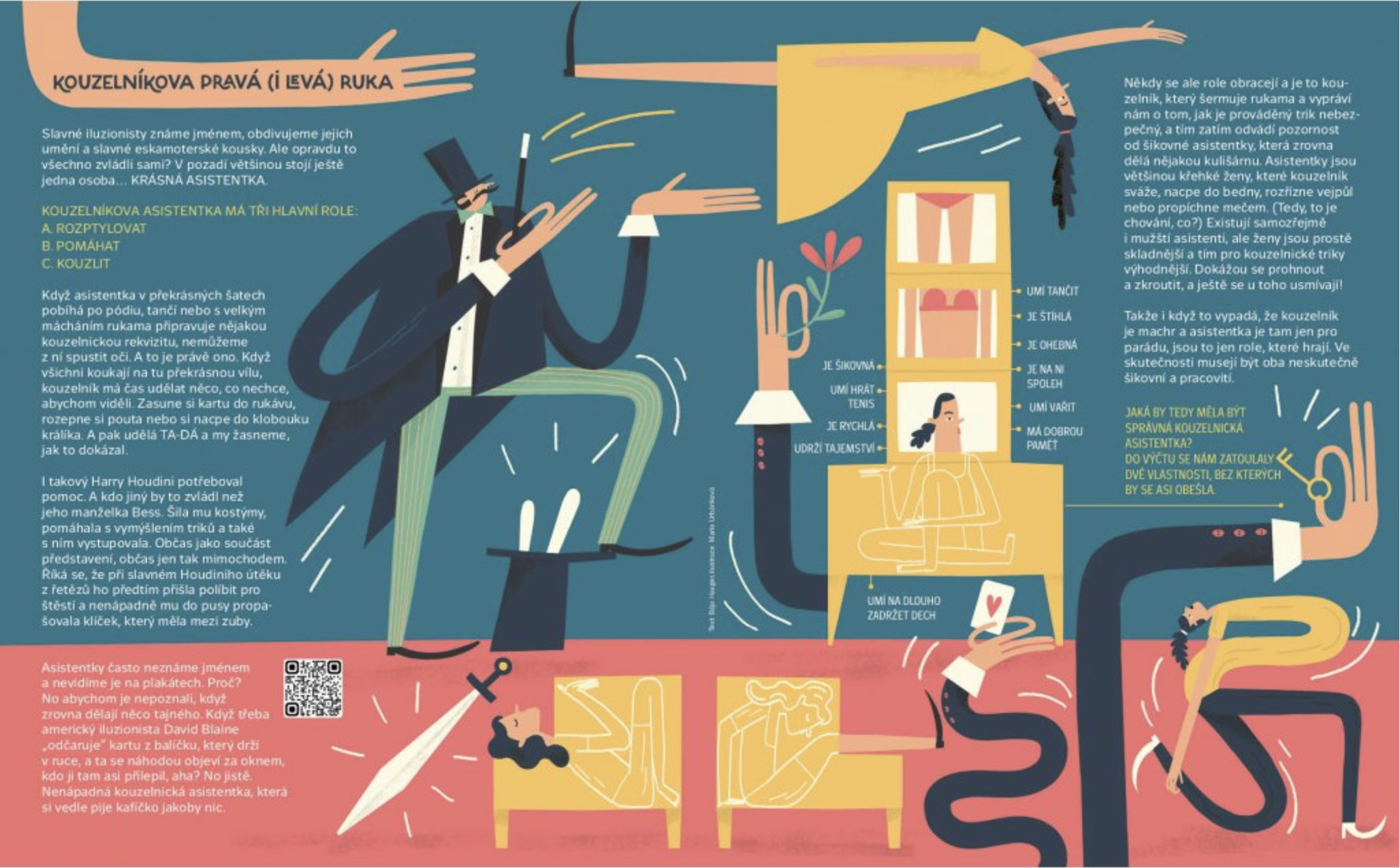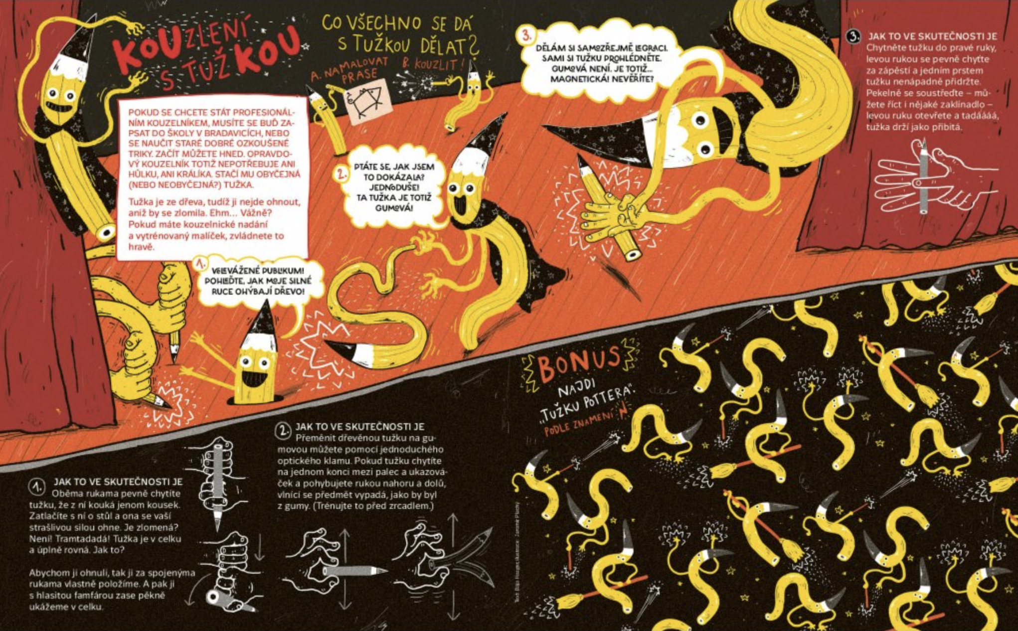 Jaké existují magické předměty a k čemu slouží. Kteří iluzionisté jsou nejslavnější a kdo jim nejvíc pomáhá. Naučíte se čarovat s tužkou i pomocí fyzikálních a chemických pokusů. Vyzkoušíte si kouzlo animace a zjistíte, jak léčí Doktor Racek rozčarovaného pana Blažka. Co odhalí hledačka v čarodějnické škole a kdo se skrývá v levitujícím bludišti v Bradavicích. Obálku nakreslil Mára Čmára.