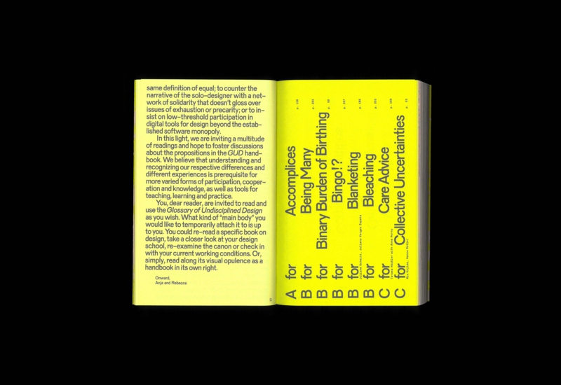 D for Dummy Woman, M for Monster’s Tools, S for Style Defense, U for Unstable Signs – the Glossary of Undisciplined Design looks into undisciplinarity as a feminist unpacking of the field of graphic design, of dogmatic rules, discriminatory structures and a particularly one-sided canon. Carried by a decidedly fragmentary and collective backbone, the GUD handbook combines a multitude of theories and narratives of varying densities – from visual essay, hands-on experiment, interview or advertorial, to poem, speculative tale and academic writing. With around 55 contributions by 20 international designers, activists, educators and theorists, the Glossary of Undisciplined Design explores role models, tools and dissent.