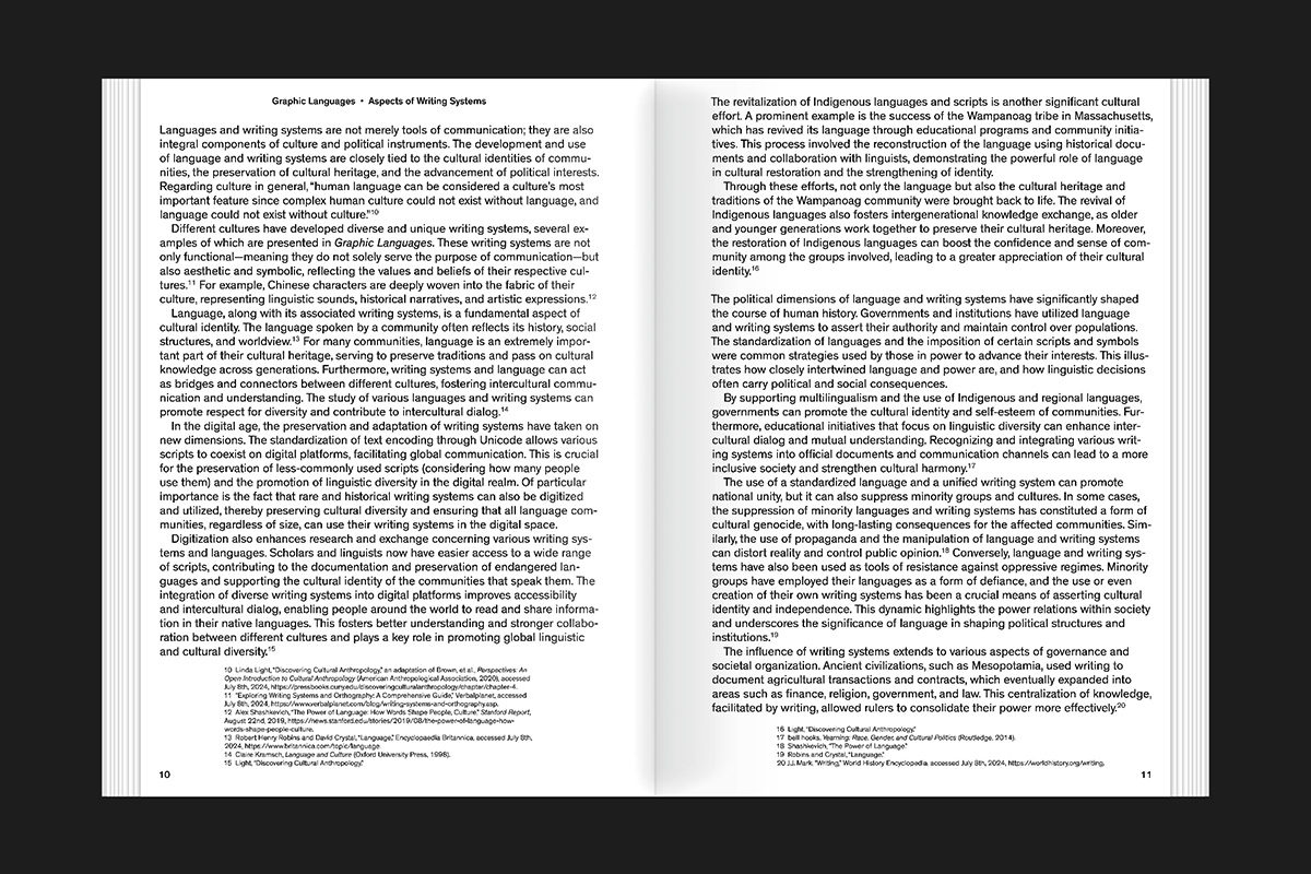 Graphic Languages je působivá vizuální cesta po nejvlivnějších písmových systémech světa — editovaná Oliverem Häuslem ve spolupráci s předními mezinárodními tvůrci písem a odborníky na typografii. Zaměřuje se na jedinečnou „DNA“ každého písma: jeho charakteristické tvary, kulturní význam a nevyčerpatelnou sílu coby základního kamene lidské komunikace. Díky důrazu na design představuje publikace jak inspirativní úvod do rozmanitosti světových písem, tak i komplexní příručku pro designéry — od studentů až po zkušené profesionály.