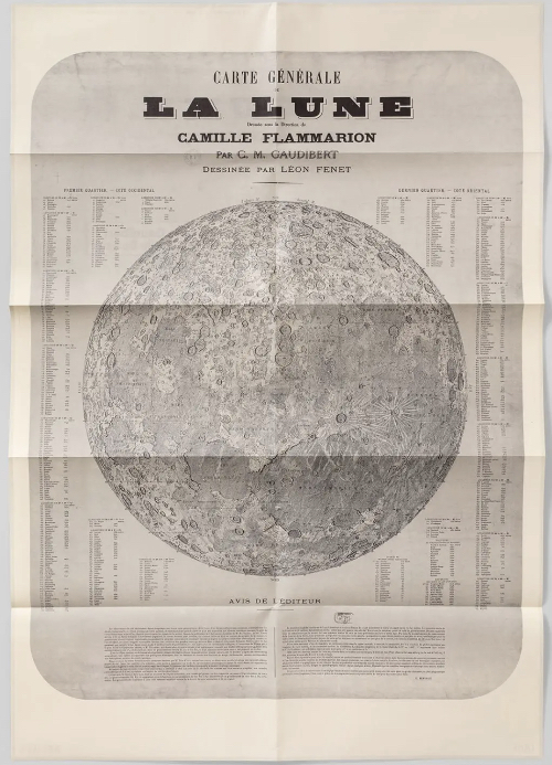 The 'General Map of the Moon' was created in 1887 under the direction of Camille Flammarion and depicts the Moon and its topography at its centre. Mountains, craters, and grooves are classified by geographical region. The lunar body is shown with north at the bottom, as it appears through astronomical telescopes.