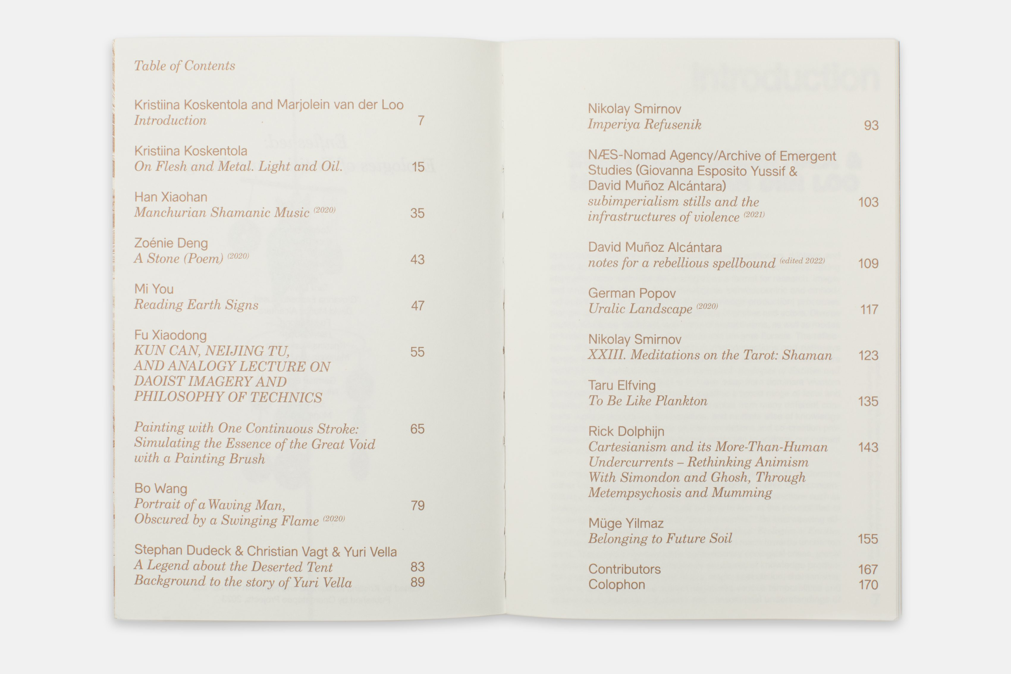 Enfleshed: Ecologies of Entities and Beings brings together practitioners, thinkers, and artists from across Eurasia to collectively explore multispecies ecologies. The volume reflects anthrodecentric and embodied approaches to collaboration and knowledge production––processes that are always interwoven with a multitude of entities and actors. In this book, the contributions flow like a river across the Eurasian continent, branching out into all directions. The contributors engage in an exploration of experimental epistemic alliances, which operate as a way to learn and make new dialogic relations. The conflicts generated by ecological disaster, war, the global economy, identity politics, and the power structures of knowledge production and science here intertwine with shamanisms, rituals, magic, speculation, politics, and poetics. How do we imagine an active and implicated role of the human as one being among other beings? What might this entail, and what might this generate?